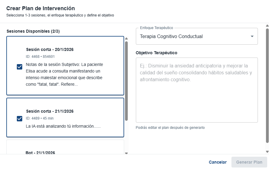 De acuerdo a tu enfoque de terapia, los datos de consulta y el objetivo terapéutico, obtén un plan de intervención sugerido en segundos que puedes editar.