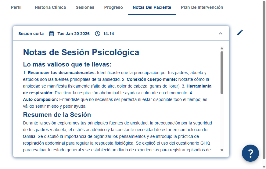 "Permite registrar las sesiones sin necesidad de tomar notas manualmente, captura datos relevantes y genera conceptos que facilitan a los profesionales la elaboración de notas clínicas y al análisis de los casos. Además, optimiza el tiempo y resulta altamente práctica en la práctica profesional."