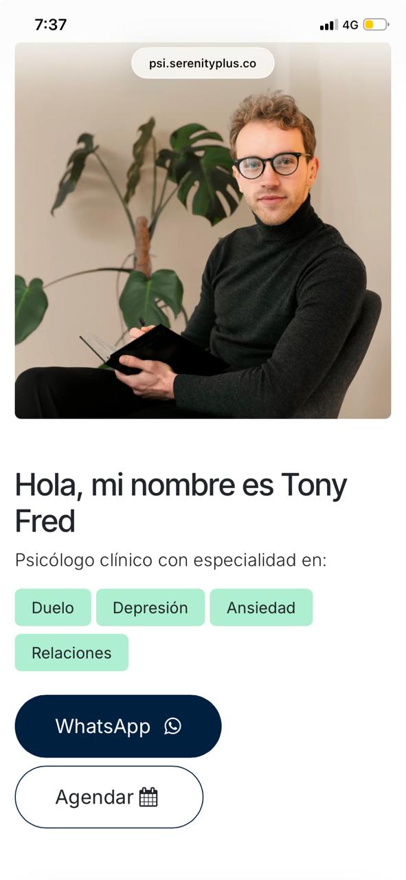 Comparte tu perfil publico profesional en redes sociales, muestra tu estilo de consulta, experiencia, servicios y conéctalo con tu Google Calendar para recibir agendamientos de tus clientes.